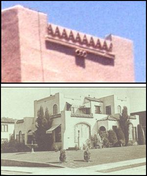 Historic photo of the Irvine and Flora Schulman House. The upper photo is a contemporary view of the Art Deco Zig Zag detail that runs along the parapets of the house.